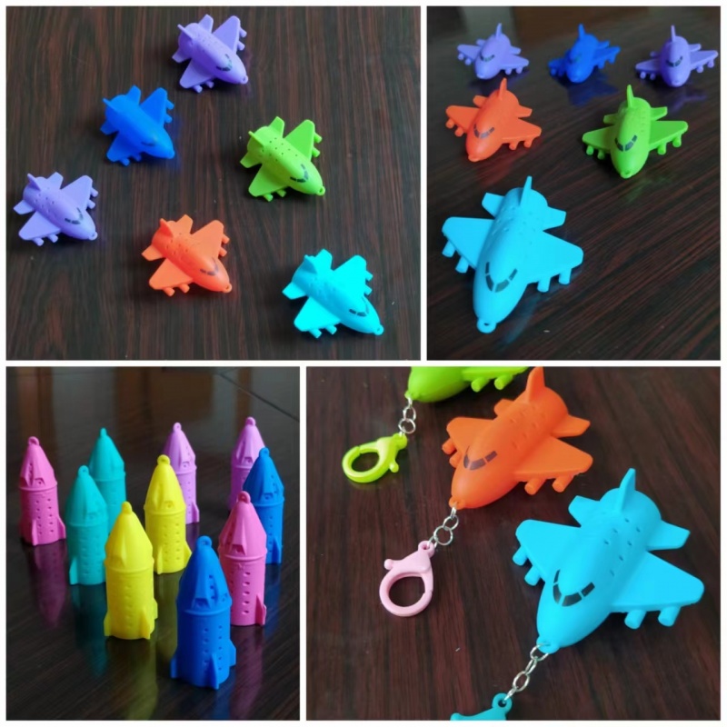 驱蚊小挂件,外壳设计为小飞机和小火箭的造型,外观时尚,外壳采用硅胶制成,上面有透气孔,内胆采用塑料制成,塑料内胆槽口与外壳卡口嵌入结合,内胆装驱蚊料,封口开透气孔便于气味溢出,达到驱蚊的目的